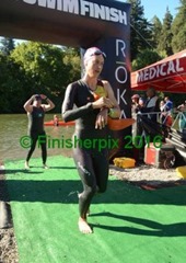 I know I need to pace myself so no sprinting at the beginning. I do try to get on a few feet but they slowly pull away from me. The water is very warm in my 5mil wetsuit so I let water into the neck area to cool myself off. This Aqua-man wetsuit from Patty Stokes of Wetsuit Rental has been awesome for the past 3 years! But today I need more than a fast suit… I’m falling back. But I’m really trying hard to keep good form, good direction, and stead pace. It’s a long back stretch but we finally turn for the 300 yd finish leg. A guy on my left making for good competition. I’m determined to beat him to shore. Every once and a while I get a surge of energy, but then followed by fatigue. Considering my training, I’m really happy to come in at 27:17, only a couple minutes off my usual pace.